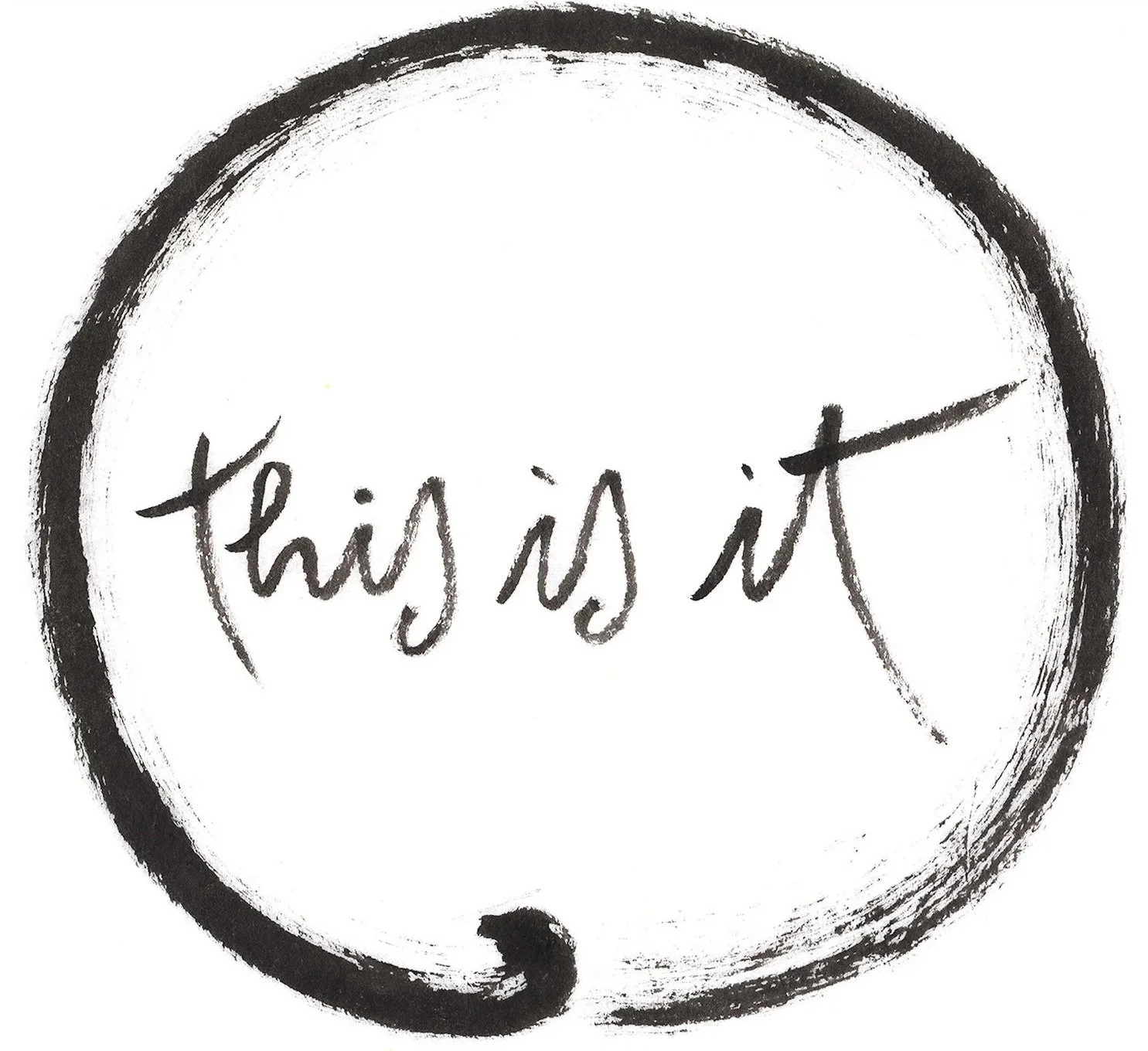 In the center of the space is a circular platform elevating a desk and chair. Sitting on the desk is an ink well some paint brushes and poster-sized blank sheets of paper. The 87-year-old monk calmly sits at the desk and prepares the ink. Over the next 20 minutes, he gives a live demonstration of his calligraphy practice. With 200 people quietly gazing at him with intense interest, he paints ensos with graceful strokes and fills each circle with a meditative phrase. He appears completely at ease, as if he is alone at home with no one else around. He is fully present. We are present with him.